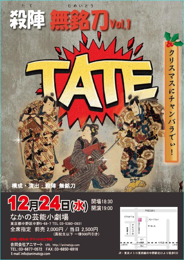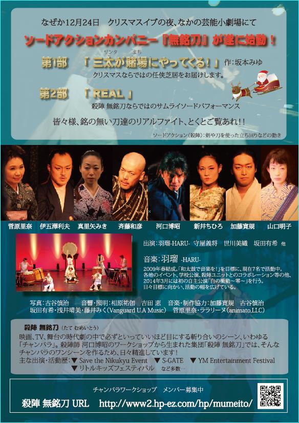 殺陣 無銘刀さんの舞台に出演することになりました。登場シーンは少しですが、この公演のテーマソングを歌わせていただく予定になっております。無銘刀さんの殺陣は何度も拝見させていただいていますが、本当にかっこいい&美しいです。張り詰めた空気に息をこらして見てしまします。いつもと違うクリスマスイブ、いかがですか?