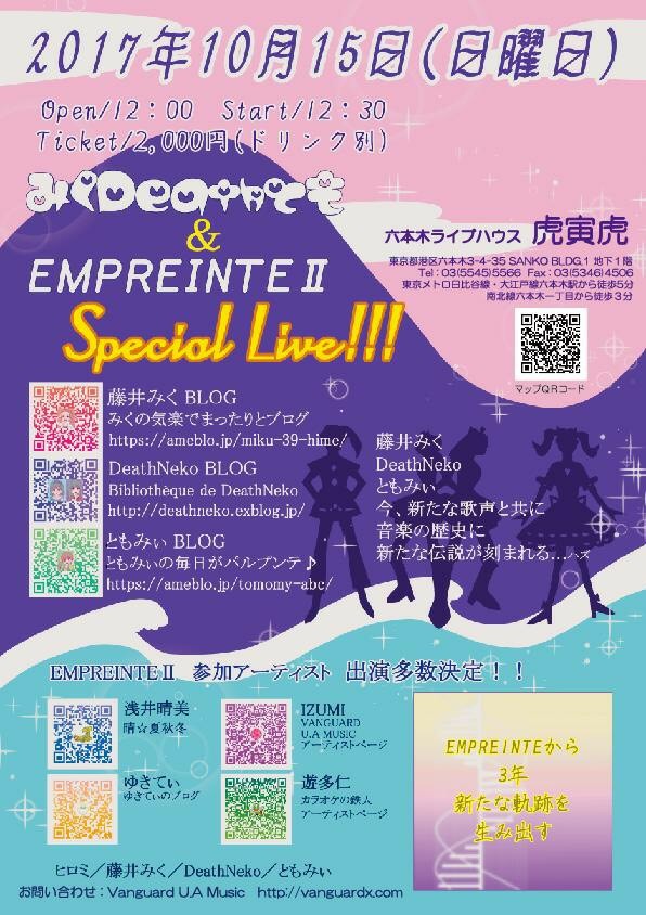 そして明日10/15(土)12:30~、六本木ライブハウス虎寅虎にて、レコ発ライブを行います。「みくDeathとも&EMPREINTEⅡスペシャルライブ!」です。よろしければこちらもぜひ~♪